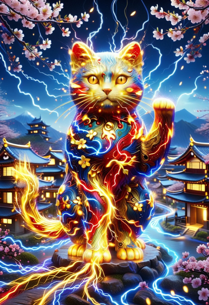 Maneki-neko made of golden and blue and red and yellow and purple lightning thunder trails, lthndrtrl, Japanese village background, cherry blossoms, vibrant, photography, high quality, detailed, realistic