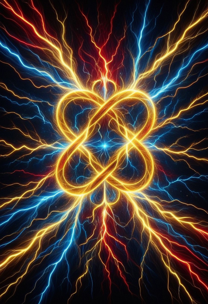 very aesthetic, very absurdres, artistic, symmetrical, infinity symbol made of golden and blue and red and yellow lightning thunder trails, lthndrtrl,