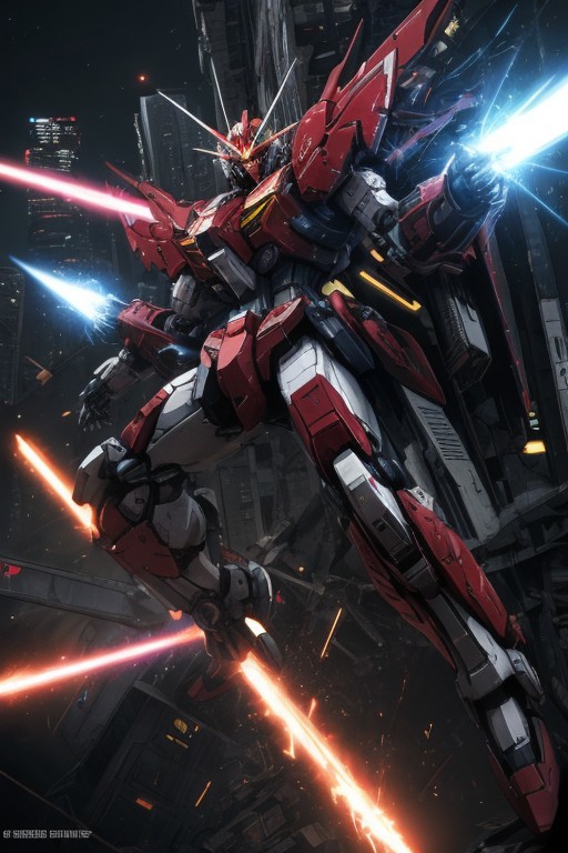A towering white-and-cobalt Gundam X Zero mecha unleashes its twin satellite cannon in a war-torn cyberpunk cityscape, glowing energy beams tearing through collapsing skyscrapers as thrusters ignite beneath its armored legs. Neon-lit debris swirls around its angular frame, with holographic targeting grids flashing across its crimson mono-eye visor while plasma flames ripple across its beam saber's energized blade.
