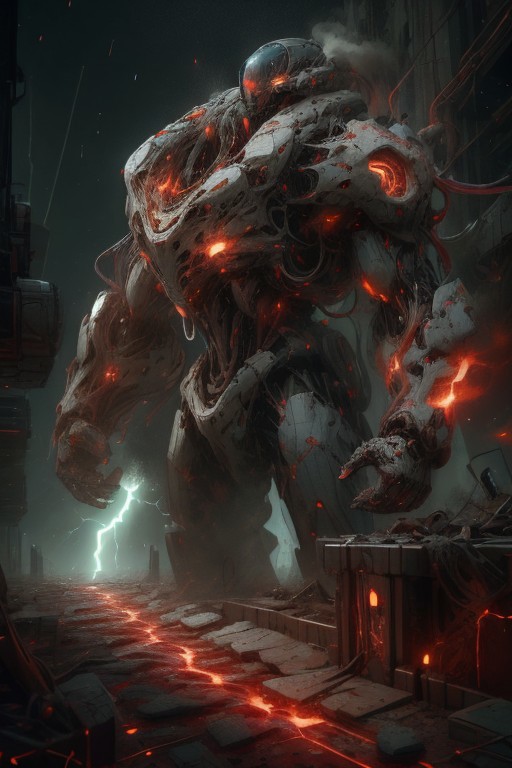 A crimson-and-obsidian armored mecha wields a plasma-charged katana in a thunderstorm-lit wasteland, its blade trailing neon-red energy arcs as it slices through a collapsing combat drone. Glowing black hydraulic joints hiss with pressurized motion while the machine's faceless helmet-style visor pulses with targeting matrices, reflected in rain-slicked armor plates adorned with fractal circuitry patterns. Behind it, smoldering craters and shattered concrete pillars frame the duel, illuminated by lightning flashes and the burning wreckage of fallen war machines. . masterpiece,best quality,ultra high res,photorealistic,8K UHD,hyper-detailed