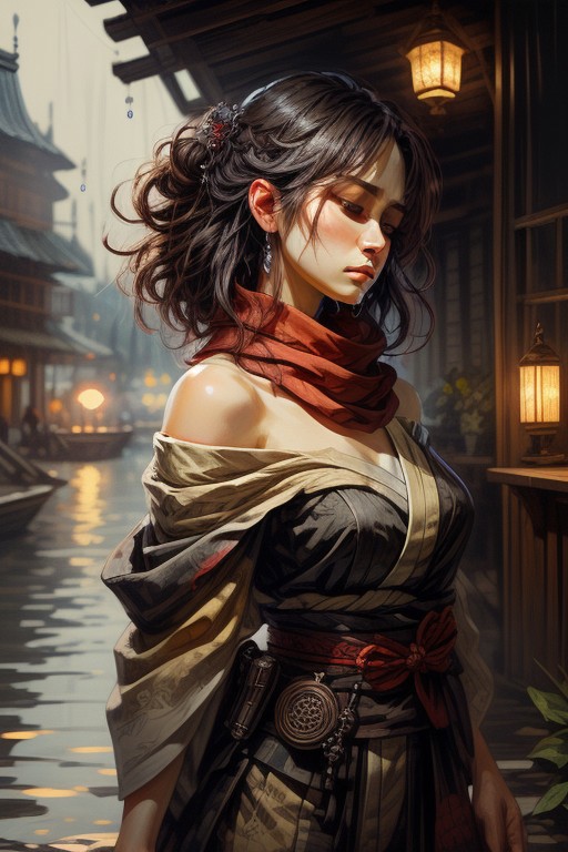 score_9, score_8_up, 8, score_7_up, solo, fantasy style, masterpiece, 8k, dynamic pose, 20 y.o, <lora:Fantasy_Classes_SD:1>, nhl-003 (guweiz, konya karasue, dino \(dinoartforame\):1.2), film grain, (cinematic:1.3), textured sketch, (lens blur:1.2), (blurry background:1.2), fisheye, backlighting, depth of field, perspective, BREAK (EyesHD:1.2), (4k,8k,Ultra HD), masterpiece, best quality, ultra-detailed, very aesthetic, sharp focus, depth of field, ray tracing, best lighting, detailed illustration, detailed background, cinematic, beautiful face, beautiful eyes, BREAK detailed background, eyelashes, erotic, looking seductive, coy. dynamic action image, detailed face, detailed eyes, direct mesmerizing gaze, BREAK (sideways glance:1.2), profile, kimono, single off shoulder, closed eyes, expressionless, head tilt, geta sandals, glowing theme, yakuza, samurai, perspective, rain outside, water drops, hair over shoulder, (bokeh:1.4), (contrapposto:1.3), arm support, arm scarf, BREAK oil painting, BadDream, negative_hand, NEG_EMBED_STABLE_YOGI_V3, FastNegativeV2, AissistV2 (detailed:1.3), (sharp focus:1.1), medieval style, (expressive face:1.2),,
