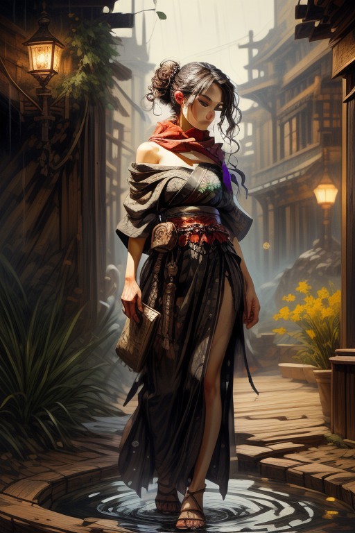 score_9, score_8_up, 8, score_7_up, solo, fantasy style, masterpiece, 8k, dynamic pose, 20 y.o, <lora:Fantasy_Classes_SD:1>, nhl-003 (guweiz, konya karasue, dino \(dinoartforame\):1.2), film grain, (cinematic:1.3), textured sketch, (lens blur:1.2), (blurry background:1.2), fisheye, backlighting, depth of field, perspective, BREAK (EyesHD:1.2), (4k,8k,Ultra HD), masterpiece, best quality, ultra-detailed, very aesthetic, sharp focus, depth of field, ray tracing, best lighting, detailed illustration, detailed background, cinematic, beautiful face, beautiful eyes, BREAK detailed background, eyelashes, erotic, looking seductive, coy. dynamic action image, detailed face, detailed eyes, direct mesmerizing gaze, BREAK (sideways glance:1.2), profile, kimono, single off shoulder, closed eyes, expressionless, head tilt, geta sandals, glowing theme, yakuza, samurai, perspective, rain outside, water drops, hair over shoulder, (bokeh:1.4), (contrapposto:1.3), arm support, arm scarf, BREAK oil painting, BadDream, negative_hand, NEG_EMBED_STABLE_YOGI_V3, FastNegativeV2, AissistV2 (detailed:1.3), (sharp focus:1.1), medieval style, (expressive face:1.2),,