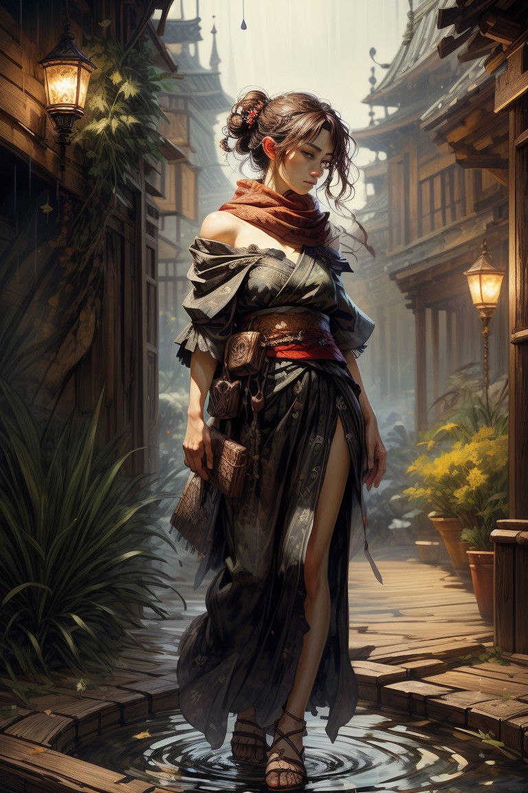 score_9, score_8_up, 8, score_7_up, solo, fantasy style, masterpiece, 8k, dynamic pose, 20 y.o, <lora:Fantasy_Classes_SD:1>, nhl-003 (guweiz, konya karasue, dino \(dinoartforame\):1.2), film grain, (cinematic:1.3), textured sketch, (lens blur:1.2), (blurry background:1.2), fisheye, backlighting, depth of field, perspective, BREAK (EyesHD:1.2), (4k,8k,Ultra HD), masterpiece, best quality, ultra-detailed, very aesthetic, sharp focus, depth of field, ray tracing, best lighting, detailed illustration, detailed background, cinematic, beautiful face, beautiful eyes, BREAK detailed background, eyelashes, erotic, looking seductive, coy. dynamic action image, detailed face, detailed eyes, direct mesmerizing gaze, BREAK (sideways glance:1.2), profile, kimono, single off shoulder, closed eyes, expressionless, head tilt, geta sandals, glowing theme, yakuza, samurai, perspective, rain outside, water drops, hair over shoulder, (bokeh:1.4), (contrapposto:1.3), arm support, arm scarf, BREAK oil painting, BadDream, negative_hand, NEG_EMBED_STABLE_YOGI_V3, FastNegativeV2, AissistV2 (detailed:1.3), (sharp focus:1.1), medieval style, (expressive face:1.2),,