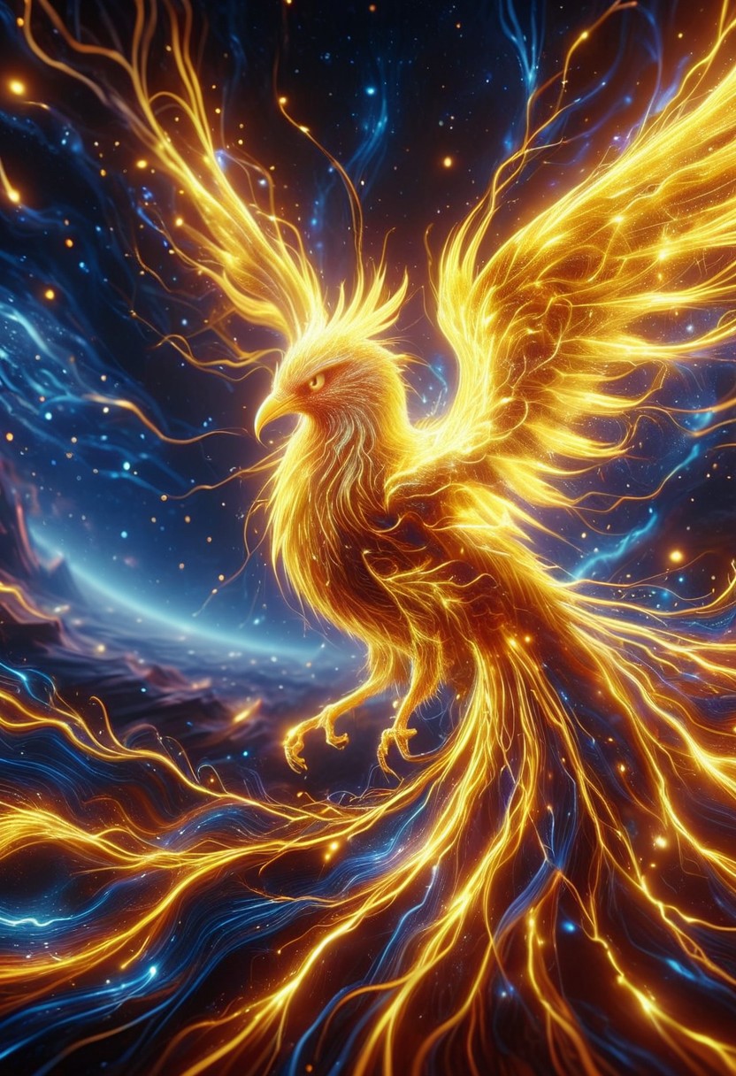 Phoenix high quality, ultra detailed, highly detailed, high detail, artistic lighting, centred depth of field, perfect soft lighting, fantasy world under the universe inside of wind rushing through its 8k resolution, best quality, cinematic
