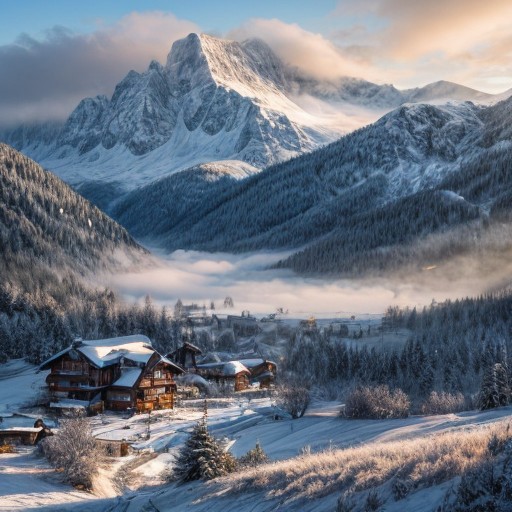 landscape, magic village in mountains, snow, snowing, morning haze, winter, sunlight,