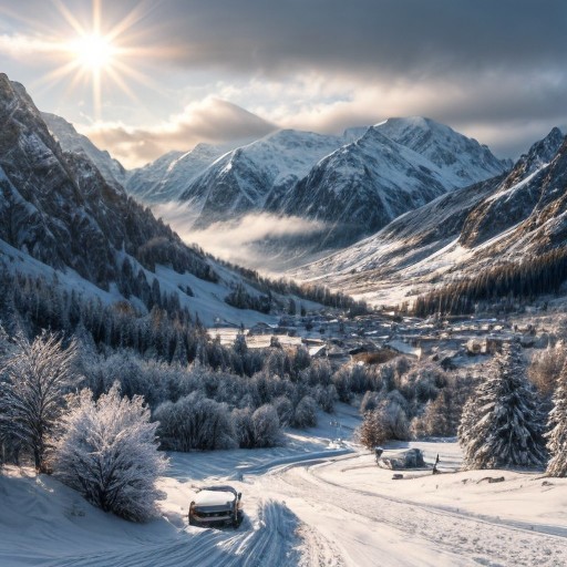 landscape, magic village in mountains, snow, snowing, morning haze, winter, sunlight,