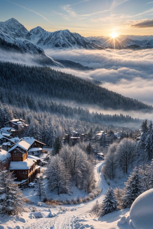 landscape, magic village in mountains, snow, snowing, morning haze, winter, sunlight,