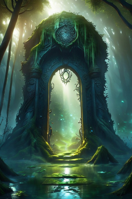 RAW photo, (masterpiece:1.3), subsurface scattering, heavy shadow, (high quality:1.4), (intricate, high detail:1.2), professional photography, HDR, High Dynamic Range, realistic, ultra realistic, photorealistic, high resolution, film photography, ambient lighting, atmospheric effects, <lora:detail_slider_v4:2>, OverallDetail, bare tree, butterfly, door, fantasy, fire, forest, light rays, nature, no humans, outdoors, portal, scenery, sky, tree, water, <lora:Portal:0.8>, in a sinister and dark fantasy swamp, moss, water, FanSwa, <lora:FantasySwamps-11:0.7>, epiCPhoto