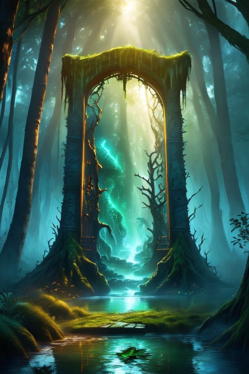 RAW photo, (masterpiece:1.3), subsurface scattering, heavy shadow, (high quality:1.4), (intricate, high detail:1.2), professional photography, HDR, High Dynamic Range, realistic, ultra realistic, photorealistic, high resolution, film photography, ambient lighting, atmospheric effects, <lora:detail_slider_v4:2>, OverallDetail, bare tree, butterfly, door, fantasy, fire, forest, light rays, nature, no humans, outdoors, portal, scenery, sky, tree, water, <lora:Portal:0.8>, in a sinister and dark fantasy swamp, moss, water, FanSwa, <lora:FantasySwamps-11:0.7>, epiCPhoto