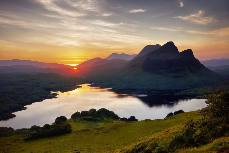 RAW photo, (masterpiece:1.3), subsurface scattering, heavy shadow, (high quality:1.4), (intricate, high detail:1.2), professional photography, HDR, High Dynamic Range, realistic, ultra realistic, photorealistic, high resolution, film photography, ambient lighting, atmospheric effects, <lora:detail_slider_v4:2>, OverallDetail, <lora:Highlands:1>, highlands, mountainous horizon, lake, scenery, landscape, sunset , tower