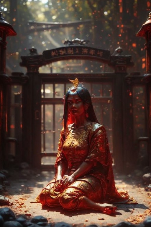 evang, forged_n_fire, Obsidian, evangstyle , image of stunning woman, gold and red color scheme, sitting in front of tori gate, dappled sunlight