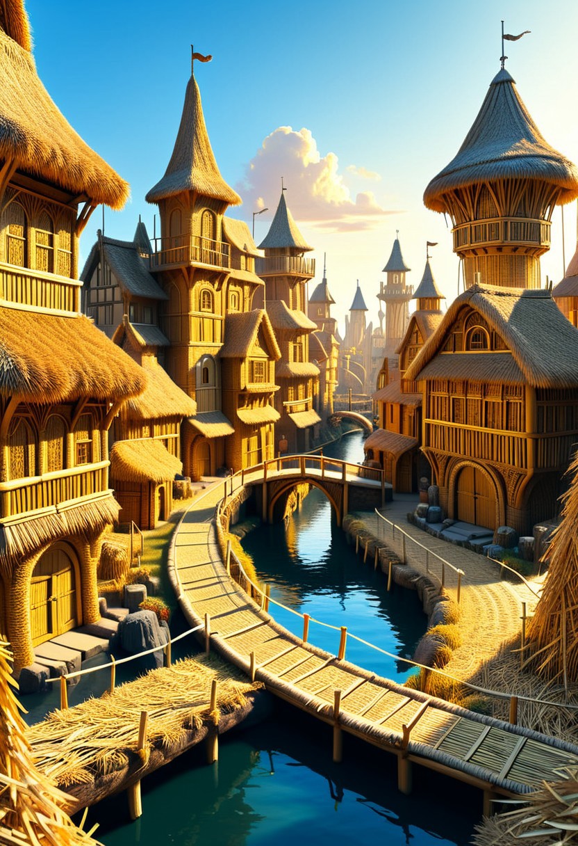 extremely detailed city made of straw, intricate straw architecture, woven straw buildings, fantasy village design, straw bridges, rustic texture, golden hour lighting, hyper-detailed, 8k resolution, trending on ArtStation and DeviantArt, concept art, cinematic atmosphere, whimsical details, magical realism, ultra high definition, masterpiece, atmospheric depth, fantasy concept art, volumetric lighting, richly textured, symmetrical design, hyperdetailed photography, trending on artstation, trending on devianart