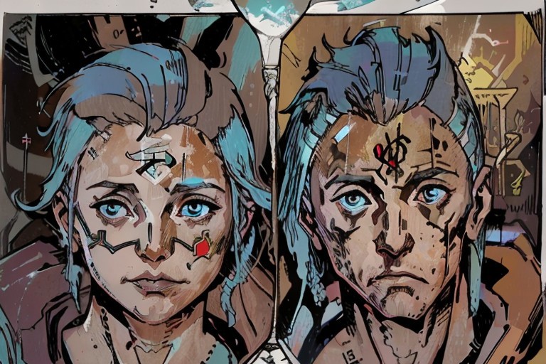 <lora:Tarotv0.2:0.8>, tarot card, the lovers, man, “A stylized Tarot card titled The Lovers (Reversed) featuring two distant figures—one mechanical male with brown hair and skin with blue eyes, one human female with blue hair and pale skin —reaching toward each other across a fractured digital landscape, with celestial symbols overhead and a broken heart motif below.”