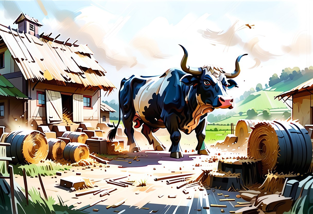 the Big Bad bull is seen forcefully blowing apart the straw house with its powerful breath. With his intense expression, he stands to the left, while the straw house collapses to the right, scattering hay and broken wood amidst a rural backdrop of green fields, rolling hills, and a gentle sky, all captured in a cartoon style, with intricate linework and watercolor details, digital art, realistic,