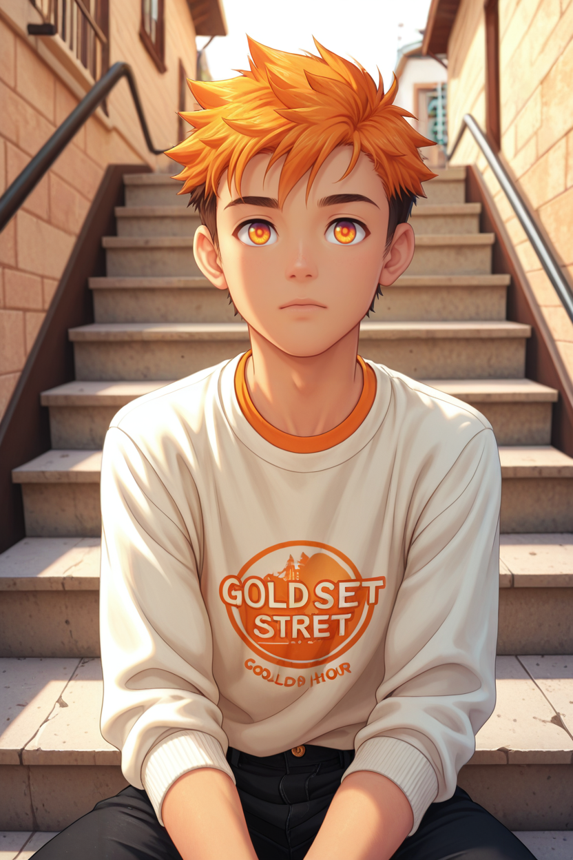 masterpiece, best quality, absurdres, highres, extremely high detail, <lora:ILCBHiro:1.0> CBHiro, 1boy, orange hair, short hair, orange eyes, looking at viewer, casual fashion, cowboy shot, sitting on stairs, vintage street, golden hour, shallow depth of field
