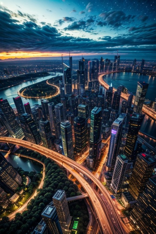 Aerial view of futuristic cityscape with towering skyscrapers, green rivers, and lush trees; high aesthetic quality, clear focus.night, <lora:artilands_v02_epoch_6:1>