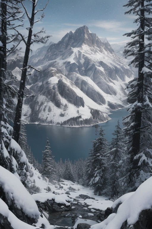 Masterpiece, high-resolution, grainy image, tall mountains, pine forest, lake, snow, galaxy, mountain trail