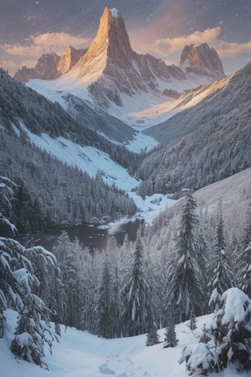 Masterpiece, high-resolution, grainy image, tall mountains, pine forest, lake, snow, galaxy, mountain trail