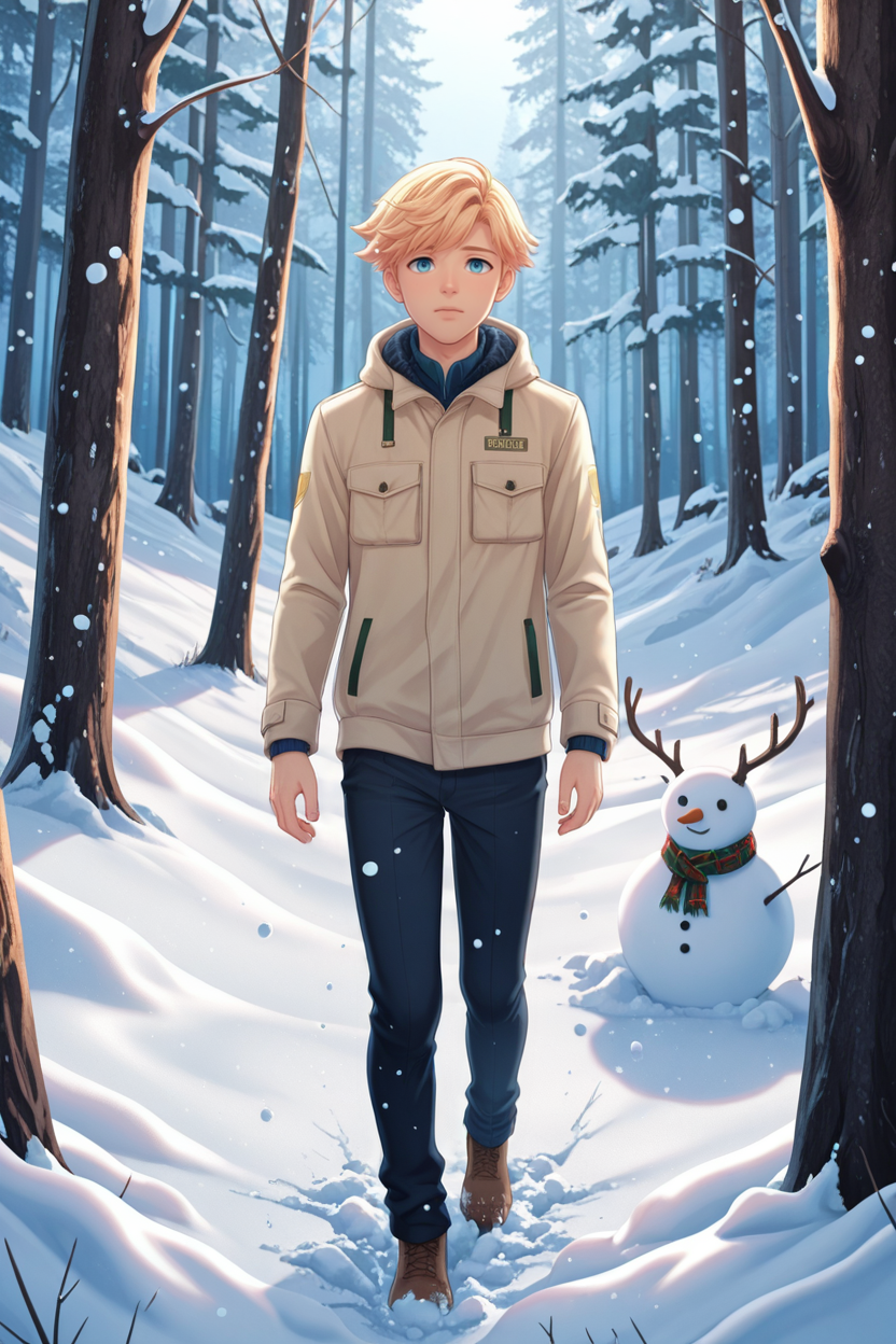 masterpiece, best quality, absurdres, highres, extremely high detail, <lora:ILCBHunter:1.0> CBHunter, 1boy, blonde hair, short hair, blue eyes, looking at viewer, standing in snow, forest background, snow falling, winter aesthetic