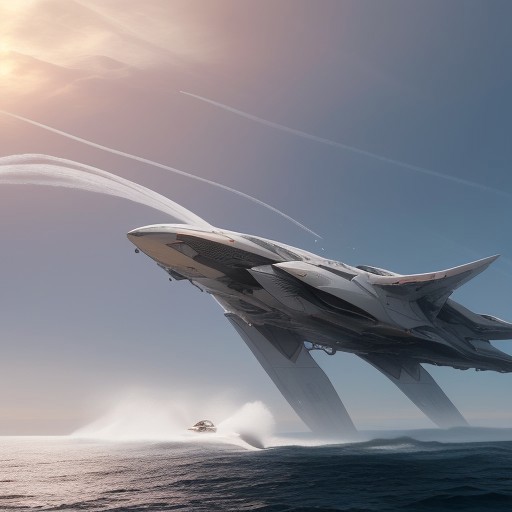 side view, Flying right above the ocean’s surface with a (((spume spindrift of water))) a pilot flying a (((futuristic spaceship))) with the aerodynamic (((chassis in the shape of a plaice))), (((surrounded by a force shield))), intricate technical details, ethereal glow, against a backdrop of white cliffs during sunset, color photograph