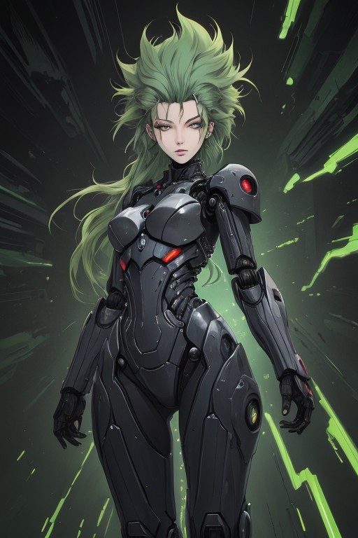 Evang, Evang_style,, robot, android woman, gray metallic skin, green hair, hair covers on one side of the head, no hair on sides of the head, black sclera, green iris, cybernetic lines across the face and body, low body detail, body and face same color, unique face, asymmetrical hair, panel lines, flat shading, short hair, mohawk, flowing hair, full body, sharp angles, dynamic pose, wide hips, covered ears, flat sides of the head, (masterpiece, best quality),