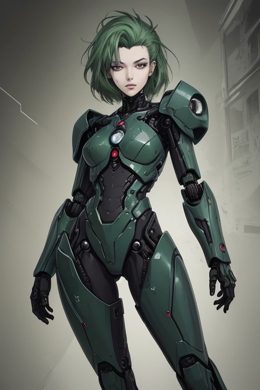 Evang, Evang_style,, robot, android woman, gray metallic skin, green hair, hair covers on one side of the head, no hair on sides of the head, black sclera, green iris, cybernetic lines across the face and body, low body detail, body and face same color, unique face, asymmetrical hair, panel lines, flat shading, short hair, mohawk, flowing hair, full body, sharp angles, dynamic pose, wide hips, covered ears, flat sides of the head, (masterpiece, best quality),