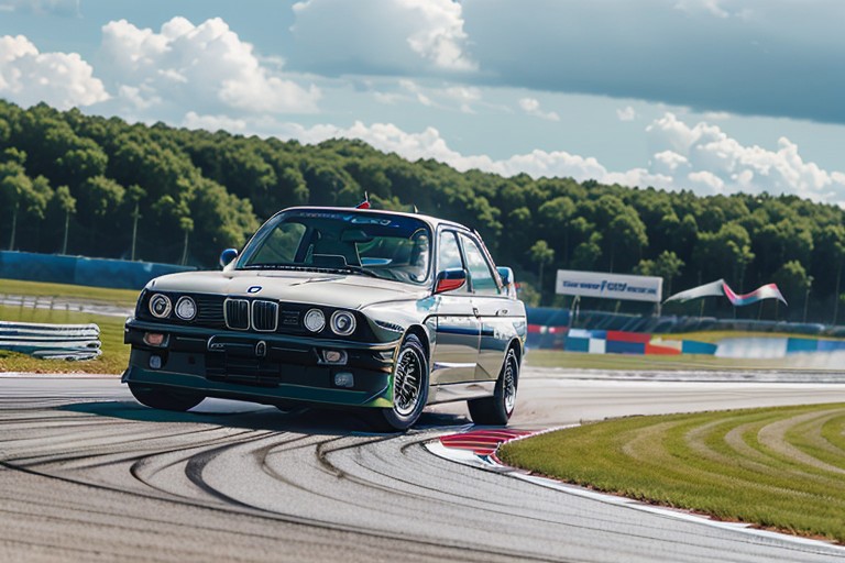 white BMW E30 car speeding in a racing circuit, <lora:bmwe30:0.75>, green grass, grandstands, blue sky, high quality photograph,sharp focus,bokeh,ligthing effects, <lora:epiNoiseoffset_v2:1>,