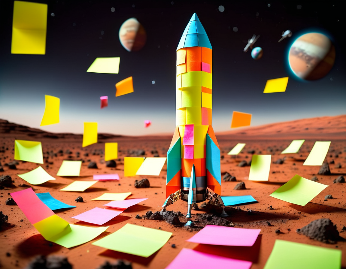 a rocket made out of Jed-StickyN landing on mars, in space, solar system, wide angle view, planets <lora:StickyNotesStyle:1>