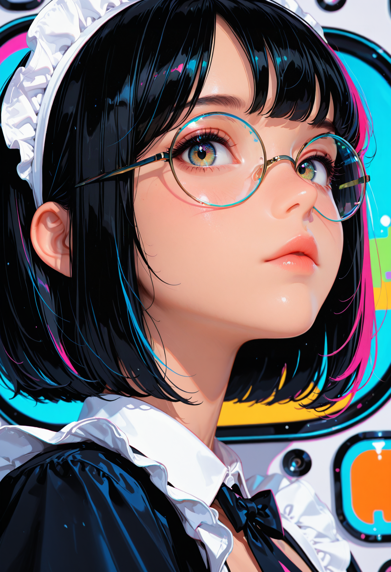 masterpiece, best quality, good quality, newest, highres, absurdres, very awa, vivid colors, flat color, 2D, strong lines, Pop Art, depth of field, focused subject, close up, stylized, in neon shades, 1girl, maid clothes, black bobcut hair, large rimless round glasses, looking at viewer, dynamic angle, from below, from side, relaxing, no lineart,no outline, <lora:DetailedEyes_V3:1> <lora:USNR_STYLE_ILL_V1_lokr3:0.45> usnr <lora:ponyv6_noobV1_2_adamW:0.9> <lora:GENESIS_MK0.2:0.5>