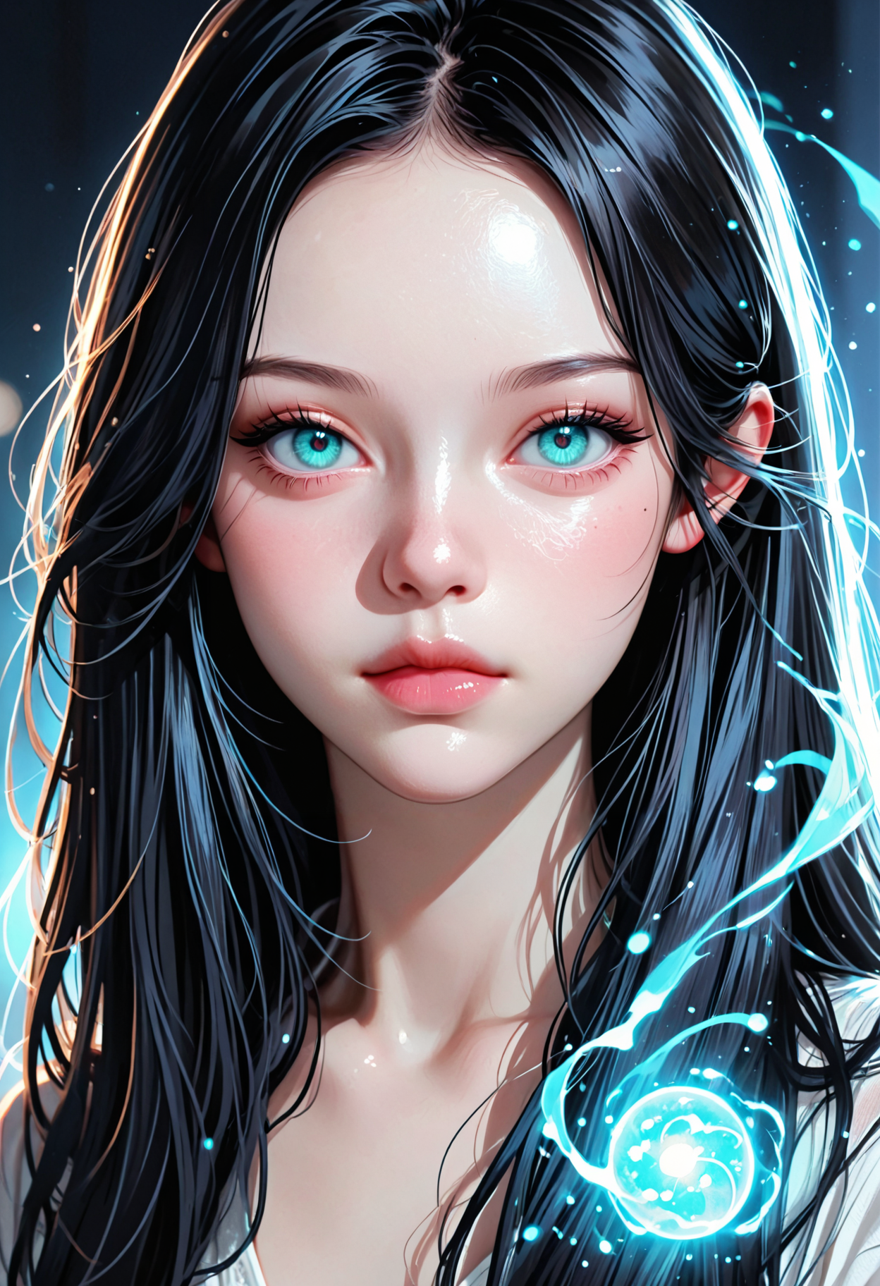 lazypos, 1girl, solo, black hair, looking at viewer, magic, long hair, closed mouth, portrait, blue eyes, glowing, hand up, aqua eyes, forehead, eyelashes, casting spell, korean woman <lora:DetailedEyes_V3:1> <lora:KoreanStyleSDXLvpred10:1> AiKoreanStyle, lips, korean, asian