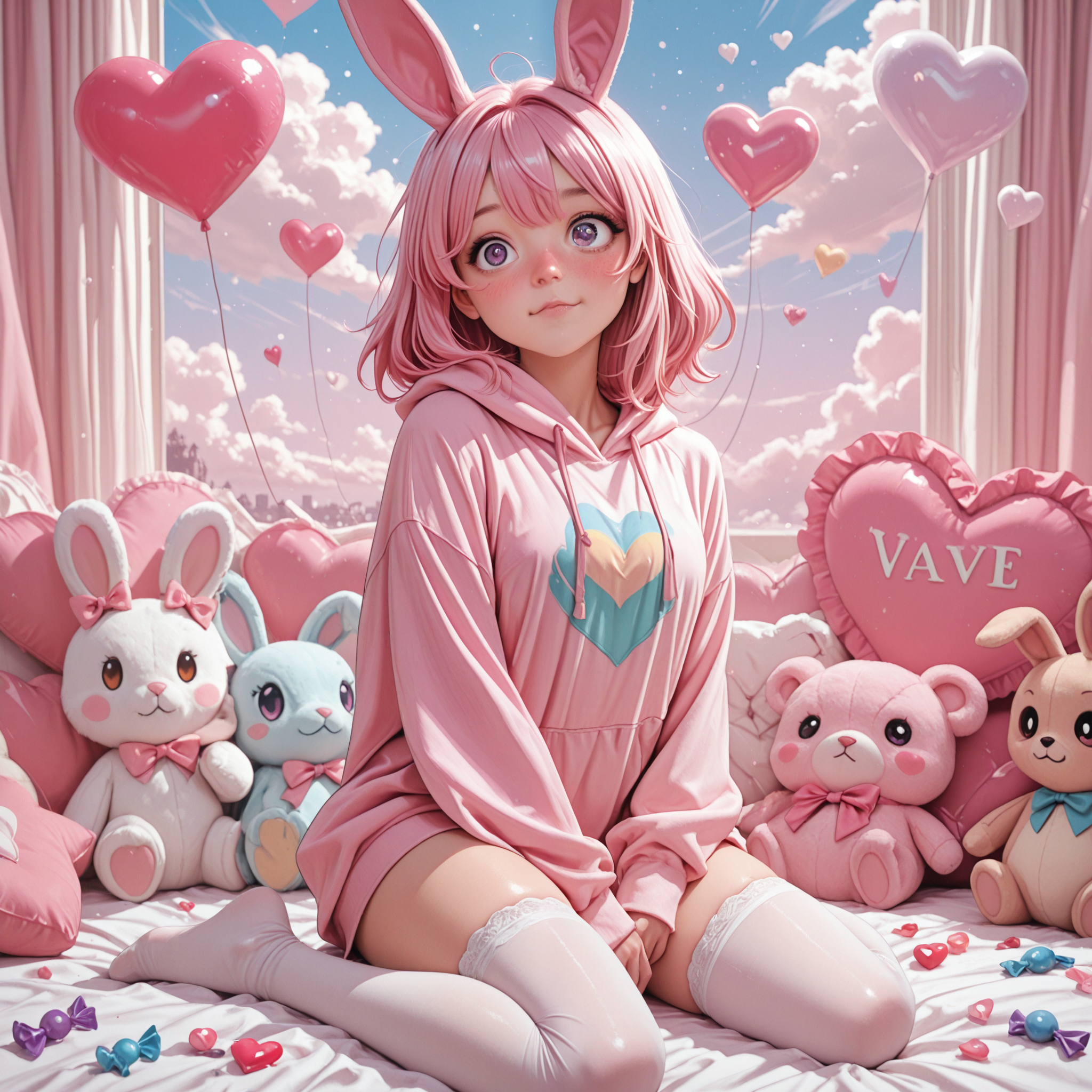 CivChan, purple eyes, pink hair, breathtaking detailed, masterpiece, awe-inspiring, radiant, magnificent, Civcan, wearing oversized pastel hoodie with bunny ears, thigh-high socks with hearts, holding a giant plushie almost bigger than her, cheeks blushing bright pink, big sparkly eyes full of emotion, surrounded by floating hearts, sparkles, and pastel clouds, background of candy rain and dreamy stars<lora:IL_CivChan.safetensors:0.8:0.8>