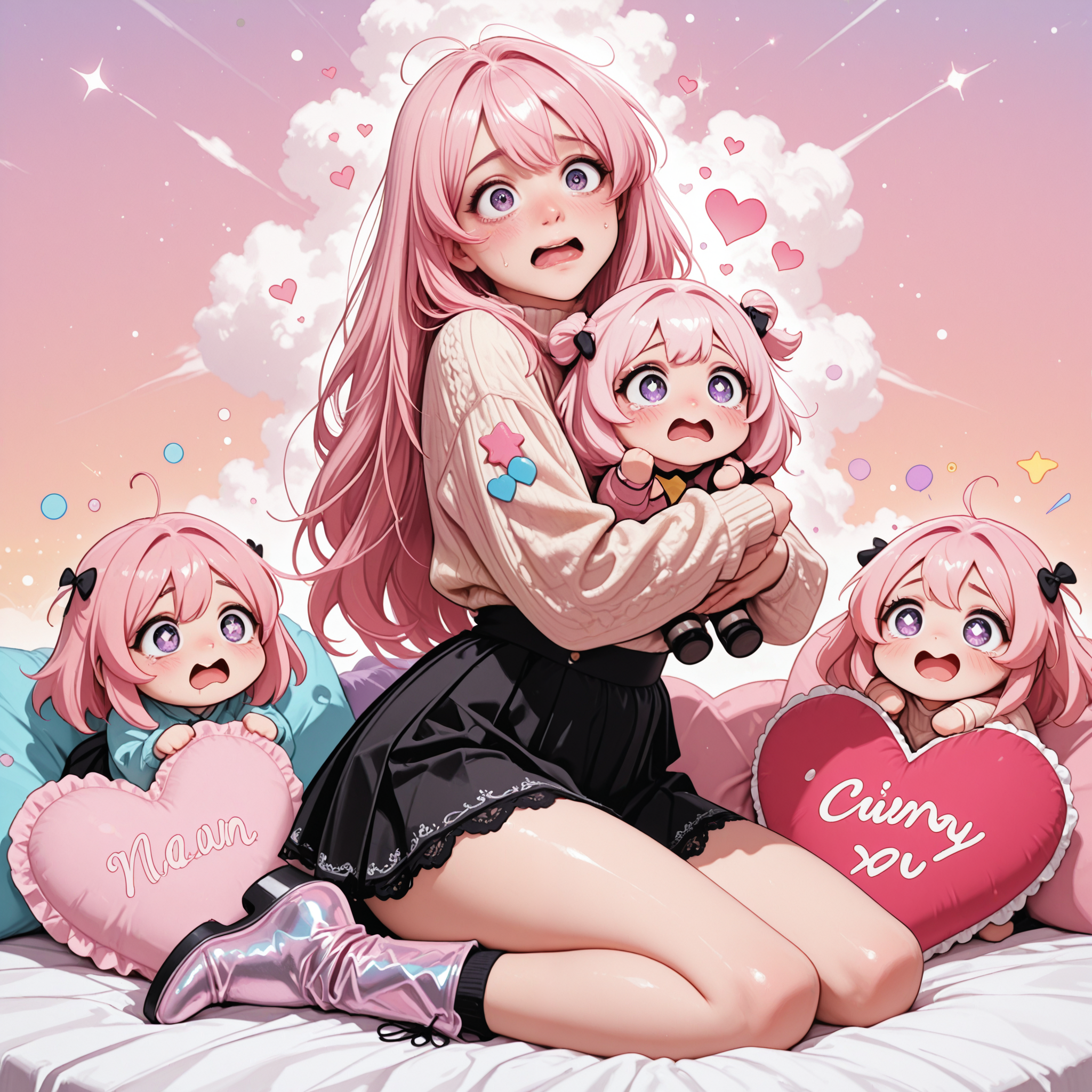 CivChan, purple eyes, pink hair, breathtaking detailed, masterpiece, awe-inspiring, radiant, magnificent, Civcan, wearing a pastel oversized sweater with star patches, long pleated skirt with lace trim, chunky boots with glitter soles, hugging a heart-shaped pillow, big sparkling eyes with teary blush, surrounded by floating sparkles, mini plushies cheering around her, soft gradient sky with dreamy clouds in the background<lora:IL_CivChan.safetensors:0.8:0.8>