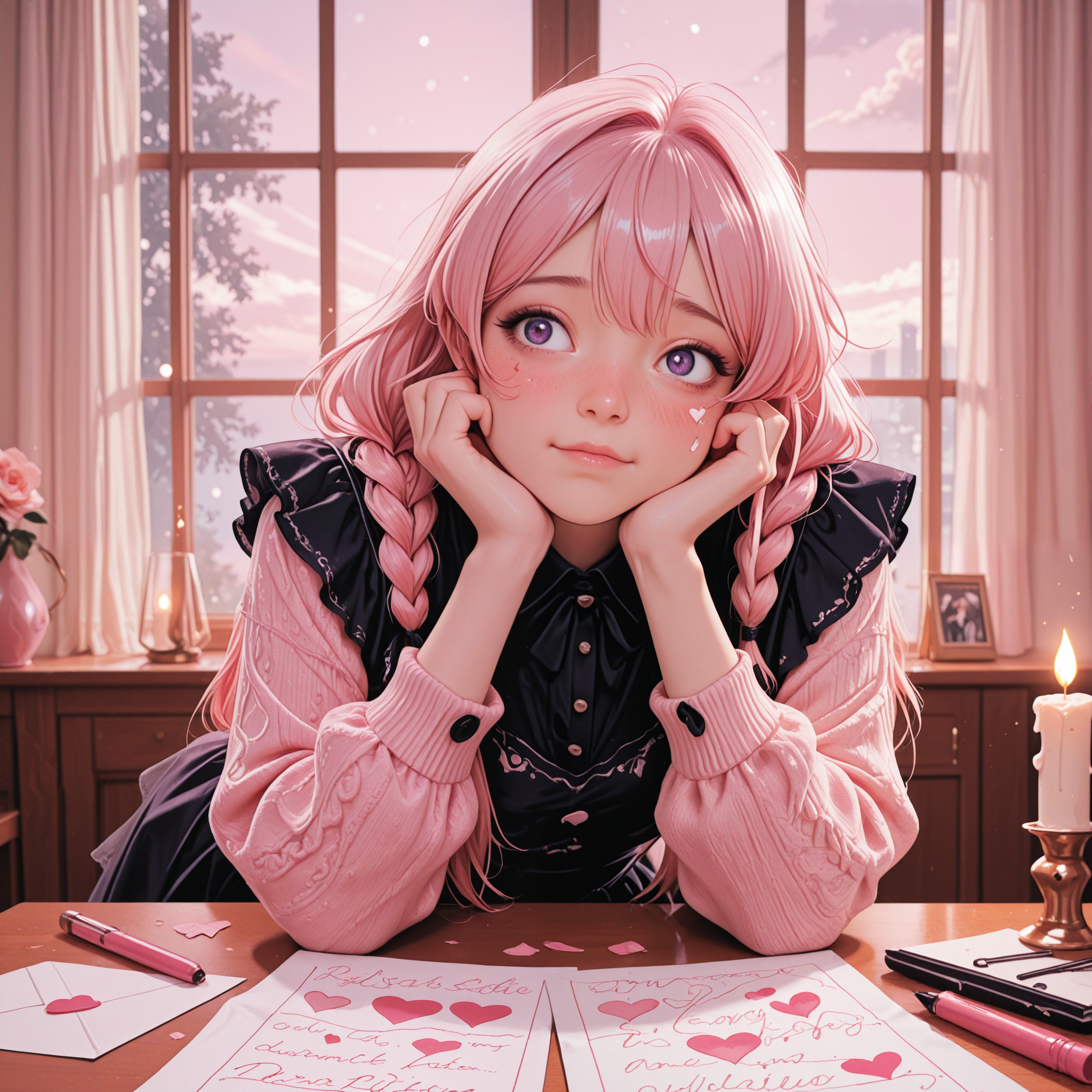 CivChan, purple eyes, pink hair, breathtaking detailed, masterpiece, awe-inspiring, radiant, magnificent, Civcan, wearing a cozy pastel cardigan over a frilly dress, sitting at a tiny desk covered in glitter pens and heart-shaped paper, writing love letters with blushing cheeks, long hair tied in twin braids with bows, surrounded by floating hearts and plushies, soft candlelight glowing, window showing a pink twilight sky<lora:IL_CivChan.safetensors:0.8:0.8>