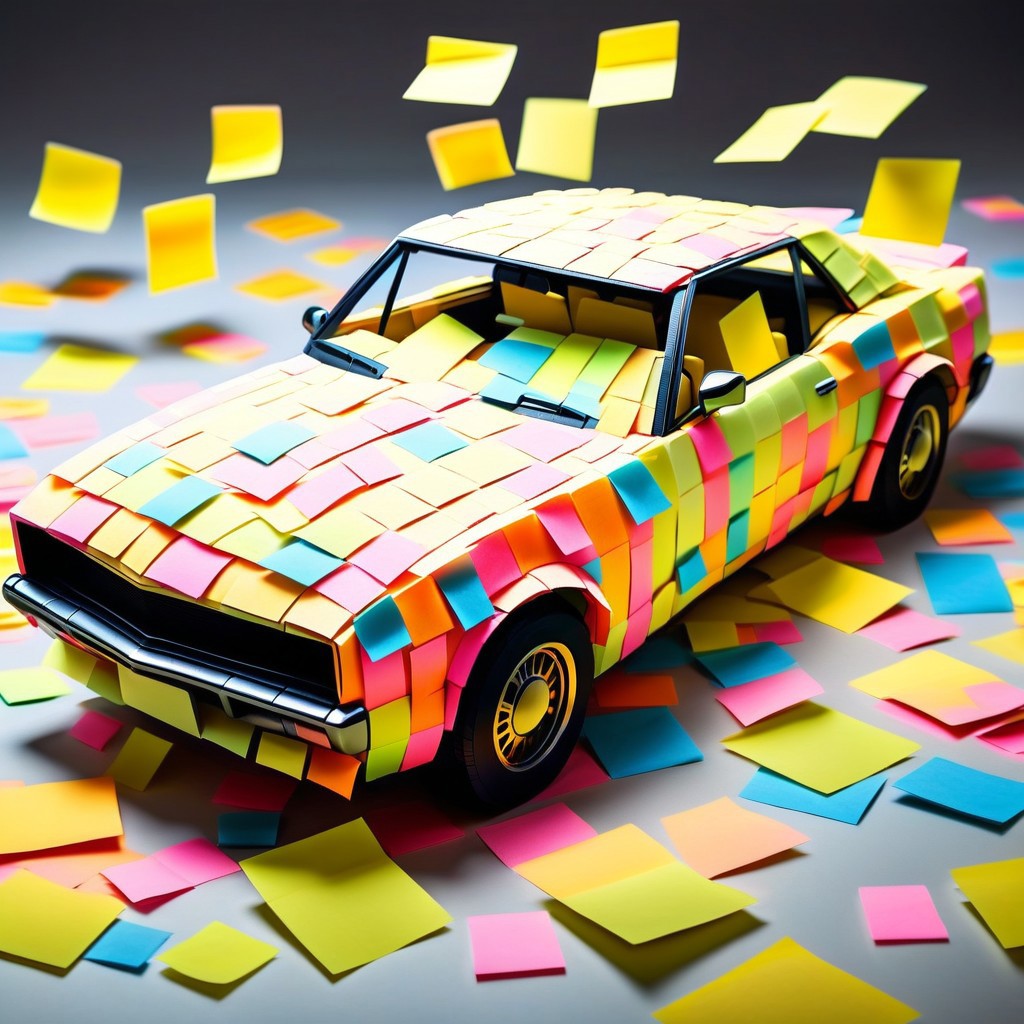 masterpiece, ultra detail, a luxury car made of StickyNotes, driving at high speed, leaving a trail of StickyNotes in the air, fast and furious style