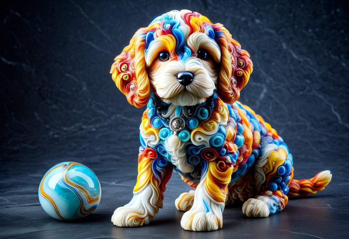 Cavapoo puppy, futuristic, detailed, made of marble, colourful