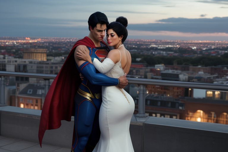 1boy, 1girl, hugging, flying through the air, cinematic film still of <lora:Superman style v1.1:1> cinematic style Kal-El, Kryptonian, Man of Steel, Superman superman statue with a red cape, looking at viewer, short hair, blue eyes, black hair, 1boy, closed mouth, cape, muscular, portrait, serious, realistic, red cape, manly, flying through the night sky over a city, full body shot, superhero, 1person, muscular male, blue bodysuit, human focus, armor, bodysuit, flying over a city, holding the woman, lislnessq,black hair,brown eyes,single hair bun, white wedding gown dress, hugging man, (insanely detailed, masterpiece, best quality) solo,<lora:LoisLaneSSQ:0.8>, vignette, highly detailed, high budget, bokeh, cinemascope, moody, epic, gorgeous, film grain, grainy