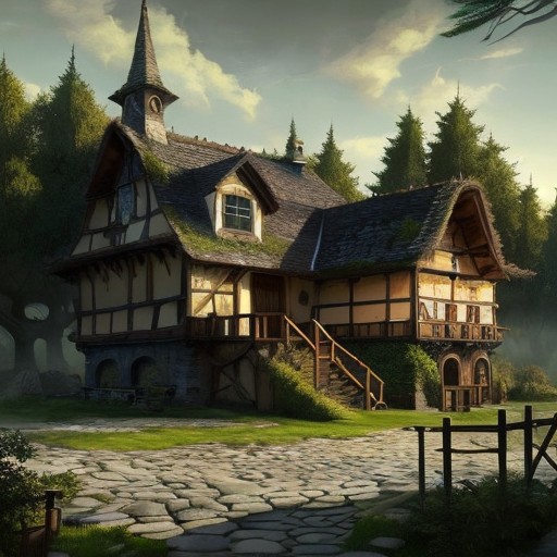 RAW photo, (masterpiece:1.3), subsurface scattering, heavy shadow, (high quality:1.4), (intricate, high detail:1.2), professional photography, HDR, High Dynamic Range, realistic, ultra realistic, photorealistic, high resolution, film photography, ambient lighting, atmospheric effects, <lora:detail_slider_v4:2>, OverallDetail, <lora:CrossroadsInn:1>, ambiguous gender, bare tree, brown hair, bucket, building, bush, cafe, cart, chimney, cloudy sky, crossinn, day, door, fantasy, fog, garden, gate, gradient background, grass, grey sky, holding, horse, house, ladder, lamp, landscape, lantern, nature, outdoors, overgrown, pavement, pine tree, plant, potted plant, scenery, sheath, stairs, stone floor, stone stairs, stone wall, town, water, wheel, window, wooden fence , <lora:storybook_last:1.2>