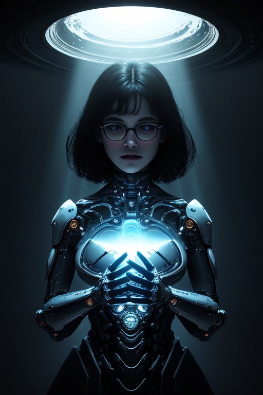 A black frame, in the center a keyhole through which the room is visible (a quantum luminous supercomputer with a mechanical manipulator in the form of a robotic arm, this hand is shaken by a joyful girl in a short white coat, large breasts and glasses and short dark hair in the style of a square).... .. . The background is minimalist, a gradient of shadowy blue tones, amplifying the ethereal and futuristic ambiance of the scene. . A palpable sense of pure, overwhelming ecstasy and otherworldly emotion is expressed through a psychedelic, repeating, anaglyph chromashift glitch effect. The entire composition reverberates with a feeling of digital decay and rebirth, as if trapped inside an ancient portal observed through a game camera lens.. ., .. (Depth of field), . Dark, Moody, Volumetric light, backlight, An otherworldly atmosphere. (Depth of field), low saturation, detail. mythical, stylish, charismatic. , , masterpiece, ,Image quality, , CPA, UNI_SCI_FI_CORE. with yellow rays of sunlight piercing through the misty atmosphere. masterpiece. An otherworldly atmosphere, Mysticism. mythp0rt, UNI_SCI_FI_CORE. (Depth of field),detail. Stylish, charismatic. Otherworldly atmosphere. aidmamj6.1 detail. mythp0rt, Stylish, charismatic.c.