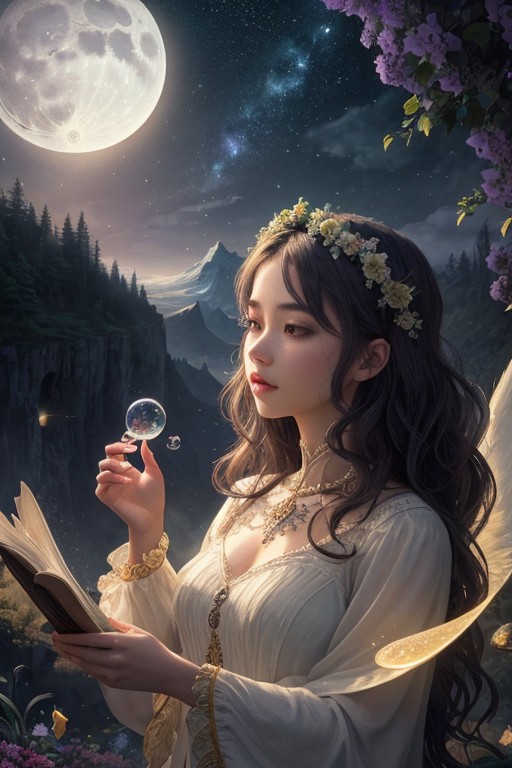 (high quality:1.4), (best quality:1.4), (masterpiece:1.4), official art, official wallpaper, surreal, beautiful goddess, (1woman:1.1), (long wavy hair:1.1), (flower crown:1.1), (mystical creatures:1.1), (floating islands:1.1), (detailed landscape:1.1), (magic in the air:1.1), (stardust:1.1), night sky, (whimsical atmosphere:1.1), (dreamlike world:1.1), (bubbles:1.1), flying books, (luna moths:1.1), (moonlight:1.1), enchanted forest, (wisdom:1.1), (powerful energy:1.1), (guardian angels:1.1), (peaceful:1.1), vibrant colors, (detailed:1.05), (extremely detailed:1.06), sharp focus, (intricate:1.03), cinematic lighting, (extremely intricate:1.04), (epic scenery:1.09), vibrant colors, (beautiful scenery:1.08), (detailed scenery:1.08), (intricate scenery:1.07), (wonderful scenery:1.05),
