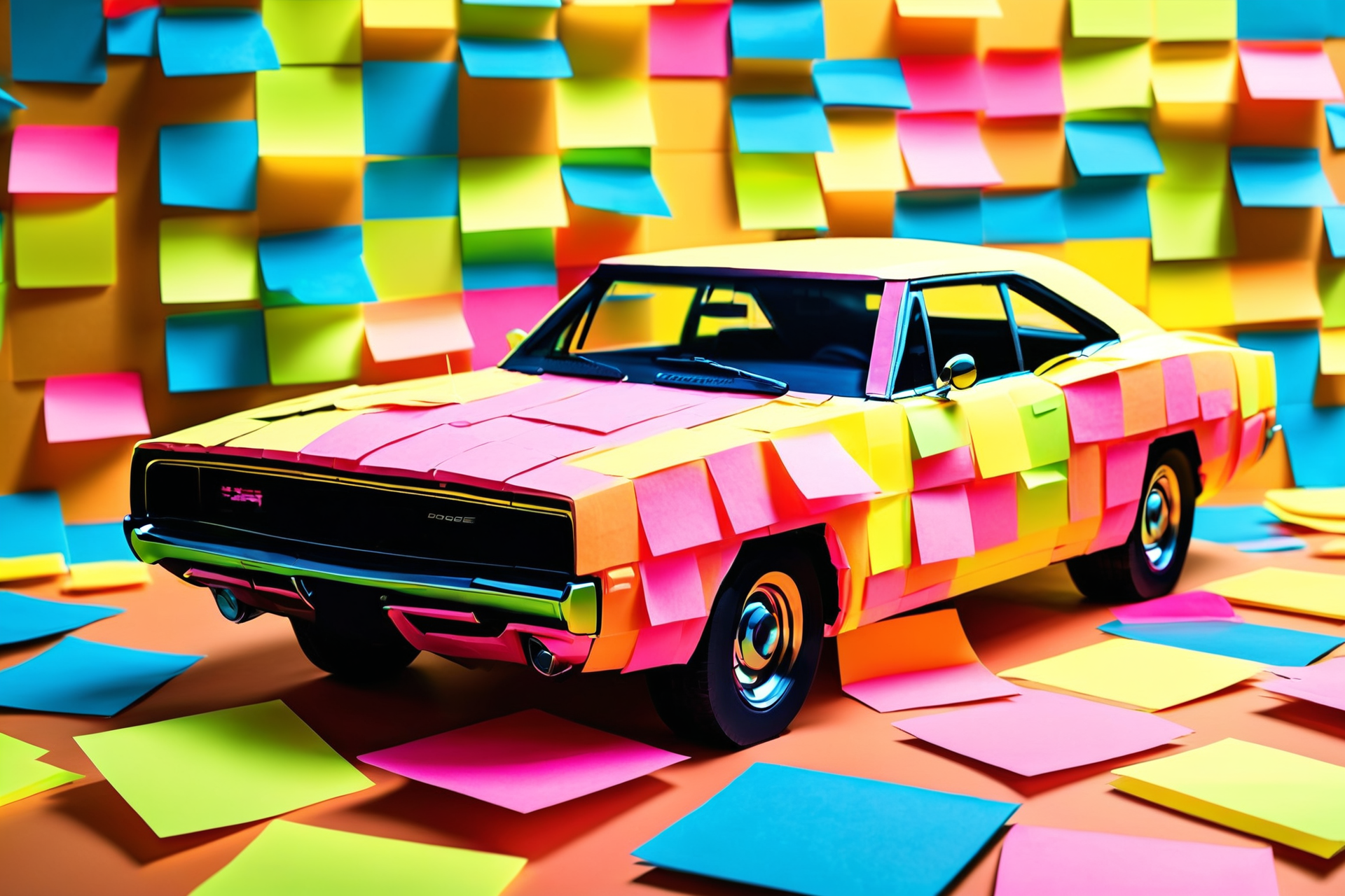 Jed-StickyN, Dodge Charger made of sticky notes, muscular build, modern city with neon lights, detailed background, best quality, vibrant colors, realistic style, high detail, hyper-realistic, highres, 4K resolution, realistic photo, masterpiece, ultra-detailed, sunlit tones, warm light, dynamic angle, wide shot, <lora:StickyNotesStyle:1>