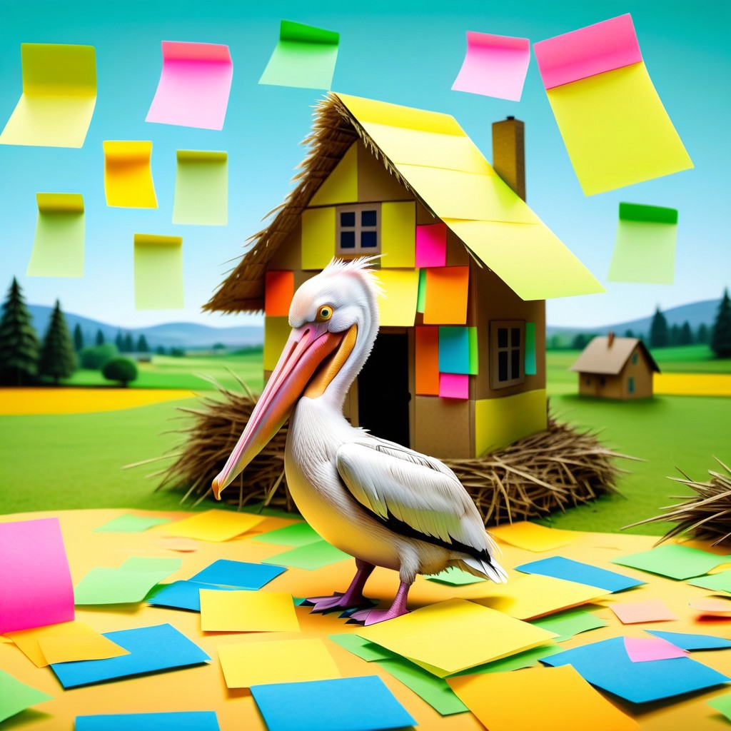 masterpiece, ultra detail, a hard working pelican wearing a hay hat, building a colorfull Sticky Notes house . the character stands to the left, while the StickyNotes house to the right, scattering paper of green fields, forest, and a gentle sky,