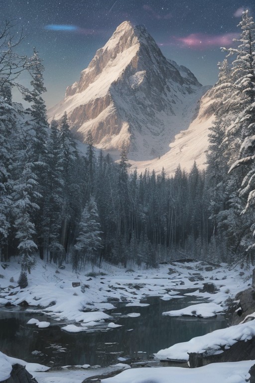 Masterpiece, high-resolution, grainy image, tall mountains, pine forest, lake, snow, galaxy, mountain trail
