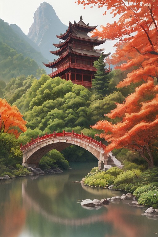 a watercolor painting depicting a serene and picturesque scene of a traditional East Asian landscape. The image features two majestic, multi-story buildings with traditional Chinese architecture, characterized by curved, tiled roofs and ornate wooden railings. These structures are situated on rocky outcrops that jut into a tranquil, reflective lake. The buildings are connected by a narrow, arched bridge that spans the lake, adding a sense of continuity and tranquility to the scene. The foreground is dominated by a large tree with vibrant red-orange leaves, creating a striking contrast against the cooler tones of the rocky landscape and the buildings. The lake is calm and mirror-like, reflecting the colors of the foliage and the architectural details of the buildings. Surrounding the lake are lush green trees and shrubs, with some trees exhibiting autumnal hues of orange and red. In the background, rugged, craggy mountains rise majestically, shrouded in a light mist, enhancing the depth and tranquility of the scene. The overall color palette is dominated by natural earth tones, with the vivid reds and oranges of the foliage adding a dynamic burst of color. The watercolor painting style is highly detailed, capturing the essence of a peaceful, ancient landscape.