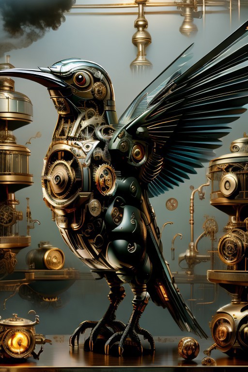 ((masterpiece)), ((best quality)), 8k, high detailed, ultra-detailed, A large mechanical ebony crow, standing on a large golden clockwork pumpkin, industrial and grimy, mechanical bird, ((nature)), ((harmonious integration)), ((technology)), steam, long black and blue metallic feathers, industrial, gear mechanisms, perched on mechanical pumpkin, dark, dirty, grimy, rusted, fluttering smoke, dark, frightening, spooky, haunted, purple glow. dark industrial factory background, liminal space, wings down, long beak <lora:MechanicalBird:0.8>, mechanical bird, DonMSt34mP,