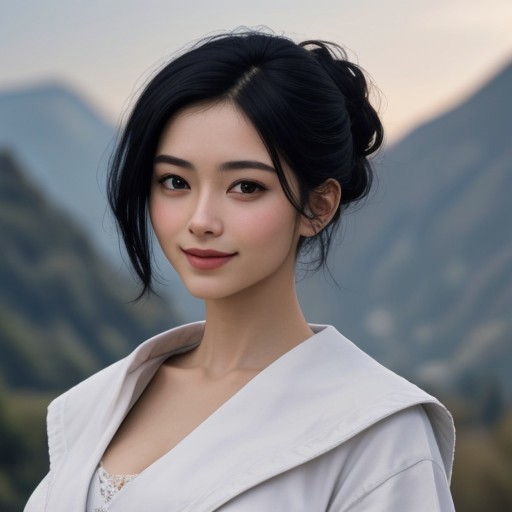 ((best quality)), ((masterpiece)), (detailed), Japanese woman, (stunning, gorgeous, beauty), (white robes, magician robes, black trim, elaborate, classy), detailed face, beautiful face, perfect face, beautiful smile, beaming smile, perfect eyes, thin face, skinny waist, slim figure, big breasts, busty, (beautiful black hair, neat hair bun, raven black), 8k resolution, (score_9, score_8_up, score_7_up, score_6_up, score_5_up, score_4_up, high res, 4k), smooth, mountain background, sunlight, lnf, realvix, smile, portrait