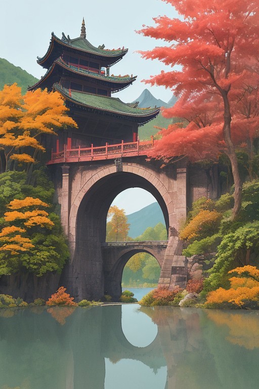 a watercolor painting depicting a serene and picturesque scene of a traditional East Asian landscape. The image features two majestic, multi-story buildings with traditional Chinese architecture, characterized by curved, tiled roofs and ornate wooden railings. These structures are situated on rocky outcrops that jut into a tranquil, reflective lake. The buildings are connected by a narrow, arched bridge that spans the lake, adding a sense of continuity and tranquility to the scene. The foreground is dominated by a large tree with vibrant red-orange leaves, creating a striking contrast against the cooler tones of the rocky landscape and the buildings. The lake is calm and mirror-like, reflecting the colors of the foliage and the architectural details of the buildings. Surrounding the lake are lush green trees and shrubs, with some trees exhibiting autumnal hues of orange and red. In the background, rugged, craggy mountains rise majestically, shrouded in a light mist, enhancing the depth and tranquility of the scene. The overall color palette is dominated by natural earth tones, with the vivid reds and oranges of the foliage adding a dynamic burst of color. The watercolor painting style is highly detailed, capturing the essence of a peaceful, ancient landscape.