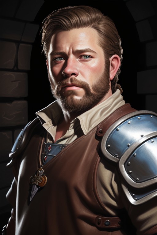 (rpg, dungeons and dragons, portrait, realistic, painting \(medium\):1.3), (1boy, male, solo, dwarf:1.2, paladin), detailed face, sad, mutton chops, brown eyes, brown hair, braided_beard, leather armor, jewelry, backlighting