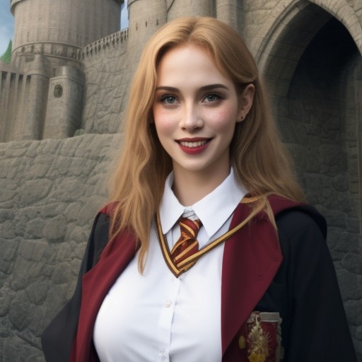 1girl, looking at the viewer, (blonde hair), brown eyes), long hair, gryffindor uniform, hogwarts school uniform, large breasts, big breasts, big tits, big boobs, sexy smile, sexy pose, inside an old castle, straigh hair, english girl, freckles, <lora:gryffindor uniform_v1_07:0.7>, half body,