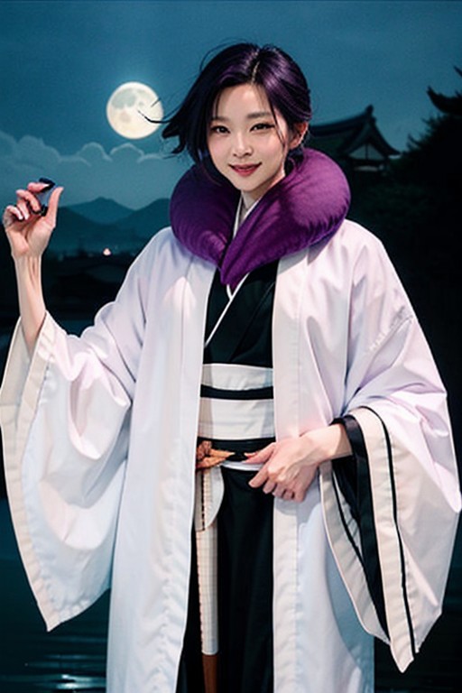 1lady female, breathtaking landscape, standing, pixiv style, female focus,full body complete, extremly short hair, moon, violet hair, black eyes,Lob long hair,Edo period, traditional Japanese architecture, pale skin,detailed eyes, water, night, night sky ,kurotsuchi_satsumi, blue hakama, geta, white coat, purple scarf, portrait, face, looking at viewer, smile, face, upper body, <lora:kurotsuchi3_rmreg-000012:0.7>,