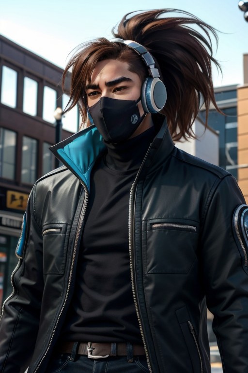 solo, looking away, sharp lighting, dramatic, vibrant, 8k hdr, dslr, (best quality), (masterpiece), yasuo td, long hair, brown hair, 1boy, jacket, ponytail, male focus, looking to the side, facial hair, mature male, stubble, <lora:Yasuo_TD:0.7>,yasuo td, mask, headphones, thick eyebrows, high collar, mouth mask, covered mouth